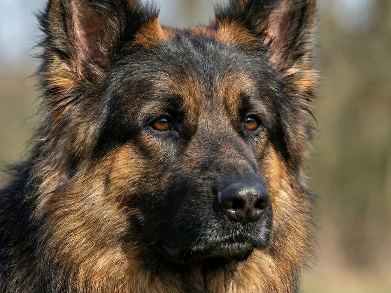 Sa tête expressive présente un stop bien marqué et un museau allongé typique des bergers allemands. Les oreilles dressées captent le moindre bruit, témoignant de sa vigilance naturelle.