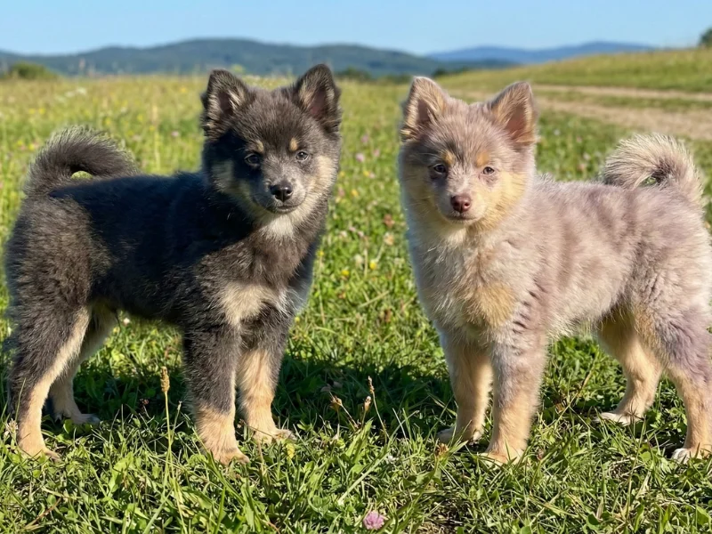 Le Klee Kai apporte son apparence typée husky miniature authentique, avec son masque facial prononcé, ses oreilles dressées et sa morphologie équilibrée. Le Pomeranian, descendant des chiens de traîneau de Poméranie, transmet sa sociabilité naturelle, son caractère enjoué et son attachement familial démonstratif.